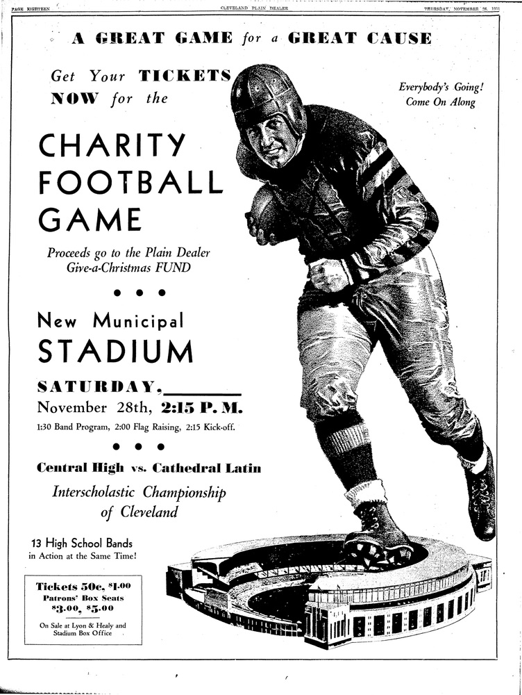 Economic collapse interrupted a large part of America's lifestyle in 1929 when income and resources declined dramatically. In 1930 government leaders at all levels sought ways to raise funds for relief of the unemployed by organizing postseason collegiate football contests. An aide to President Herbert Hoover suggested a charity football game in every city, with proceeds supporting local relief efforts. Cleveland "took the ball and ran" with a plan to organize a city championship game for charity. Coincidentally, the city was completing construction of a new lakefront stadium in July 1931 with a seating capacity over 78,000 spectators. Cleveland’s stadium commissioner approved the site for the Charity Game for rent of one dollar, ushering in the beginning of an era. Game opponents were selected after the regular high school season ended in November 1931: Cleveland Senate leader Central High would face Catholic League leader Cathedral Latin in front of 19,304 fans on ‘Thanksgiving Saturday.’ The game raised $8,200 for Plain Dealer Charities’ Give-a-Christmas food basket program. Latin prevailed 18-0 to become the city’s first Charity Game Champion. Thus began a very popular run of high school football games to determine Cleveland’s champion annually on Thanksgiving weekend for the next 37 years at Cleveland Municipal Stadium.