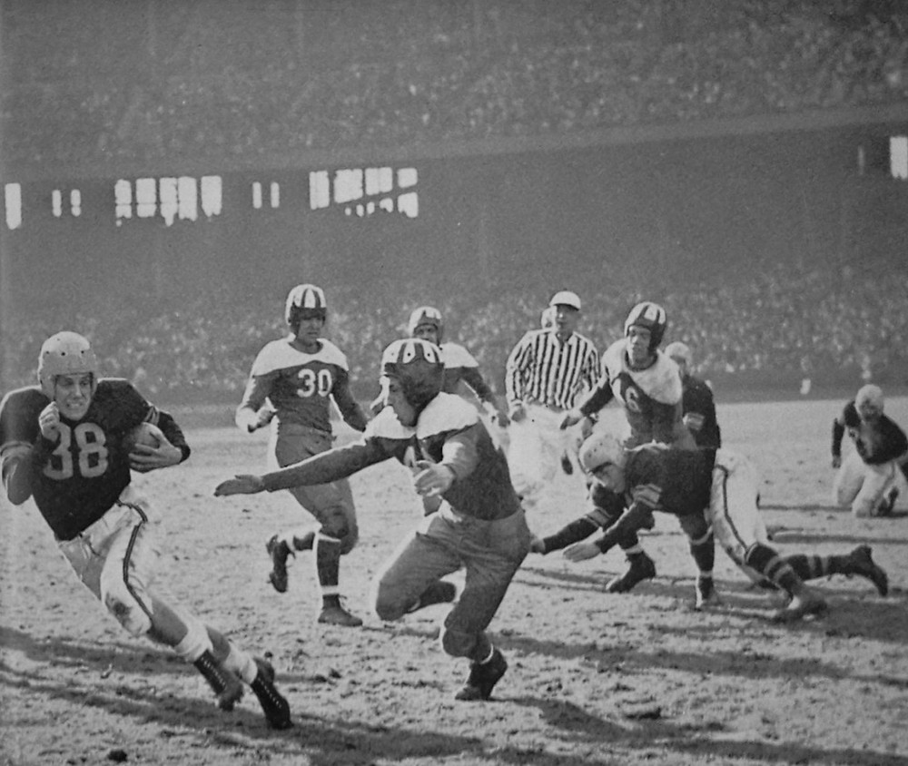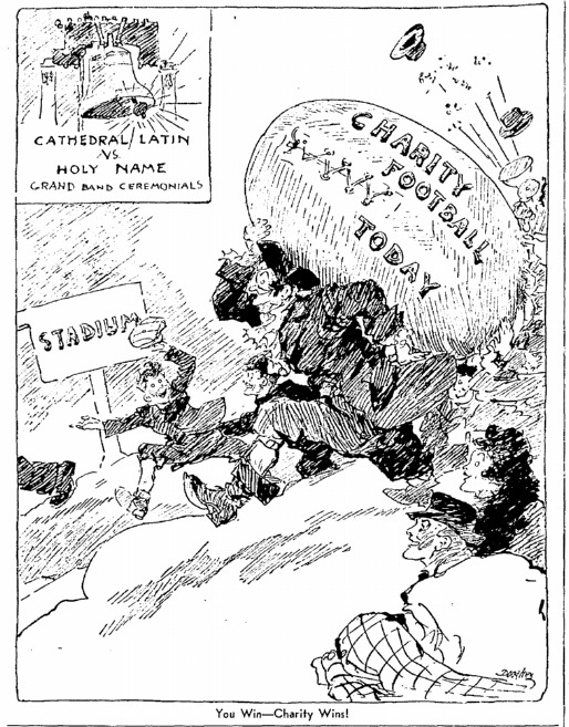Some team and league alignments were modified as Cleveland and its surroundings continued to grow. In 1936, the Cleveland Senate Athletic League was reorganized to include schools within the city limits with four Catholic high schools and 13 Cleveland public high schools in the East and West Senate divisions. The annual champs of both Senate divisions would face each other in the Thanksgiving weekend Charity game. The annual event was marked with a student poster contest, marching band competition from many area schools, and majorette and drum major competitions. The annual game grew in popularity and by 1937 drew 47,000 spectators with larger crowds arriving in the 1940s. In 1946 Cathedral Latin played Holy Name in front of 70,955 fans as envious professional teams took note. By 1953, proceeds to Plain Dealer charities exceeded $400,000 and continued to support the Give-a-Christmas fund and the Senate’s athletic insurance fund. From 1955 to 1968, the game was played on Thanksgiving Day with all the annual traditions and ceremony. Game attendance remained strong, between 20,000 and 40,000 spectators through the mid 1960s.