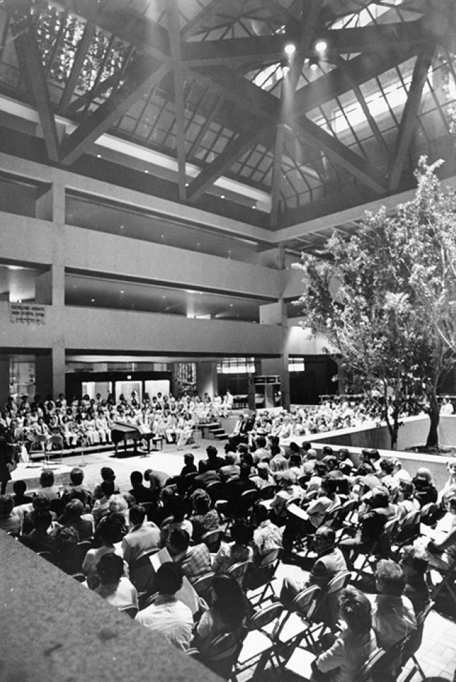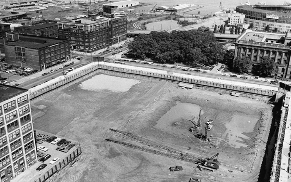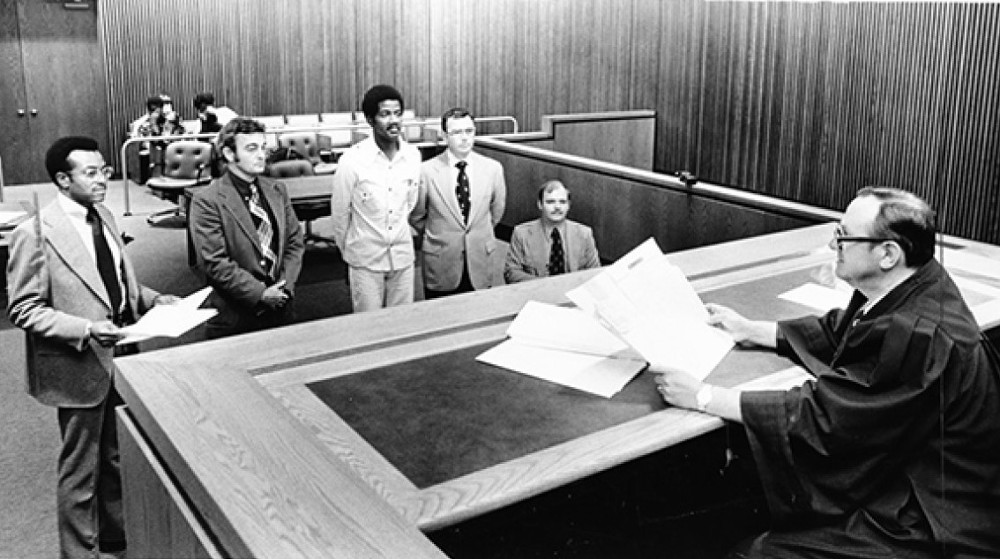 On September 15, 1976, the Justice Center was formally dedicated by U.S. Senator Sam Ervin of Watergate fame, and shortly after that event police, prosecutors, judges, clerks, and prisoners began moving in. Unfortunately, the new Justice Center soon was beset with post-construction problems which overshadowed the success of the City and County in finally building a combined court facility. In January 1977, during an electric power outage, a pump failed causing a large hot water tank to overflow and flood three floors in the Courts Tower. It wouldn't be the last time that water--too much of it in the wrong places--became a problem for the Justice Center. Later in 1977, lightning struck the 23-story Courts Tower, raining down pieces of Spanish granite on pedestrians below. In the following decades, elevator failures, which often stranded passengers for long periods of time, became routine occurrences, nervously talked about by lawyers and clients alike. The County Jail, which had been reduced in size, soon became severely overcrowded, forcing the County to build a $68 million jail annex on the site in 1994. And over the course of all these years, stories of people being knocked off their feet by gusts of lakefront wind hitting them as they traversed the long, open inclined walkway from the main entrance of the Justice Center to Lakeside Avenue became almost legendary.