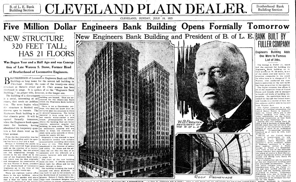 The opening of such a building should have been a festive event for the BLE, which had been headquartered in Cleveland since 1870. The union claimed the distinction of being the oldest in the country and, with 80,000 members, it was also one of the largest. And, since 1903, it had been led by one of the most capitalist--yes, capitalist--union leaders ever, Warren Sanford Stone. In 1910, under his leadership, the union had constructed the 14-story tall Engineers Building just across Ontario Street from where the BLE Bank Building would go up 15 years later. It was the first skyscraper in the country built by an employee organization. Ten years later, in 1920, the BLE, again, with Stone at its helm, founded the country's first labor bank. Officially incorporated as the Brotherhood of Locomotive Engineers National Cooperative Bank, it was from the start known to all simply as the Engineers Bank. And then, in the first five years following the founding of that bank, Stone, who also served as its president, opened 15 branch offices in cities all across the country, including New York, Philadelphia, Boston, Minneapolis and Portland, Oregon. By 1925, the BLE was invested in banks, real estate, businesses and other holdings with a total value in excess of $150 million, a huge figure in that era. When asked why he had led his union into so many capital ventures, Stone responded, "When there is trouble the owners have been inaccessible to us. They were to be found on Wall Street, no matter where the [rail]road in question was located. So we decided to buy into 'Wall Street.' Now we can sit at the same table with these men and talk things over."
