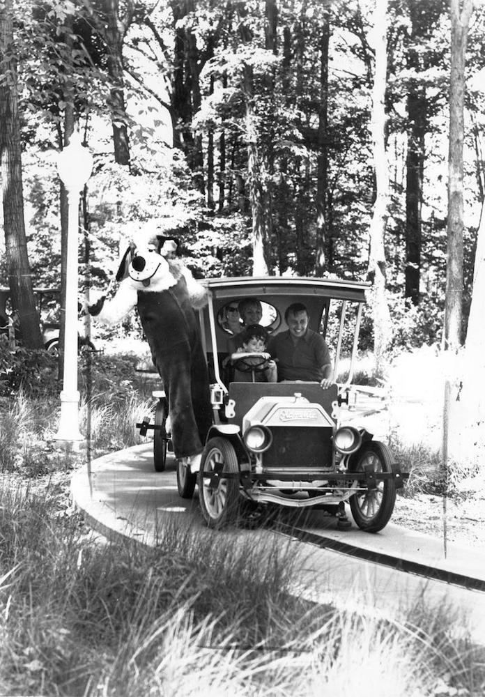 Geauga Dog, 1976 Geauga Dog is photographed here waving from a Merry-Old Mobile. Also, picture is some of the trees that comprised a forest that surrounded the lake and supported many different species including apex predators. This captures the nexus between man and “nature.” Source: Cleveland Press Collection, Cleveland State University Library Special Collections Date: 1976