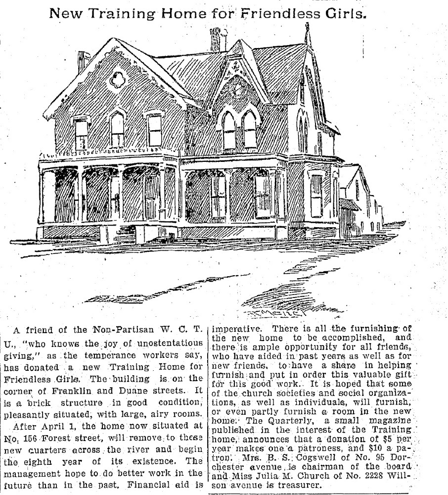 In 1899, the Training Home for Friendless Girls moved to the west side of Cleveland and into a large house at the corner of Duane Avenue (West 32nd Street) and Franklin Boulevard, after an anonymous donor purchased the house and donated it to the WCTU. The Training Home remained at this location until 1914 when the present larger house at 7200 Franklin Boulevard was built. It is three stories tall, has a brick facade and is English gothic style. The architect of the new house, which has 22 single rooms for residents, was Charles Hopkinson, who designed a number of buildings on Franklin Boulevard, including the Franklin Circle Masonic Temple. Helen Cogswell, who had founded the Home for Friendless Girls in 1892, lived long enough to see the home move into and thrive at its new location. She died four years later In 1918, at the age of 85.