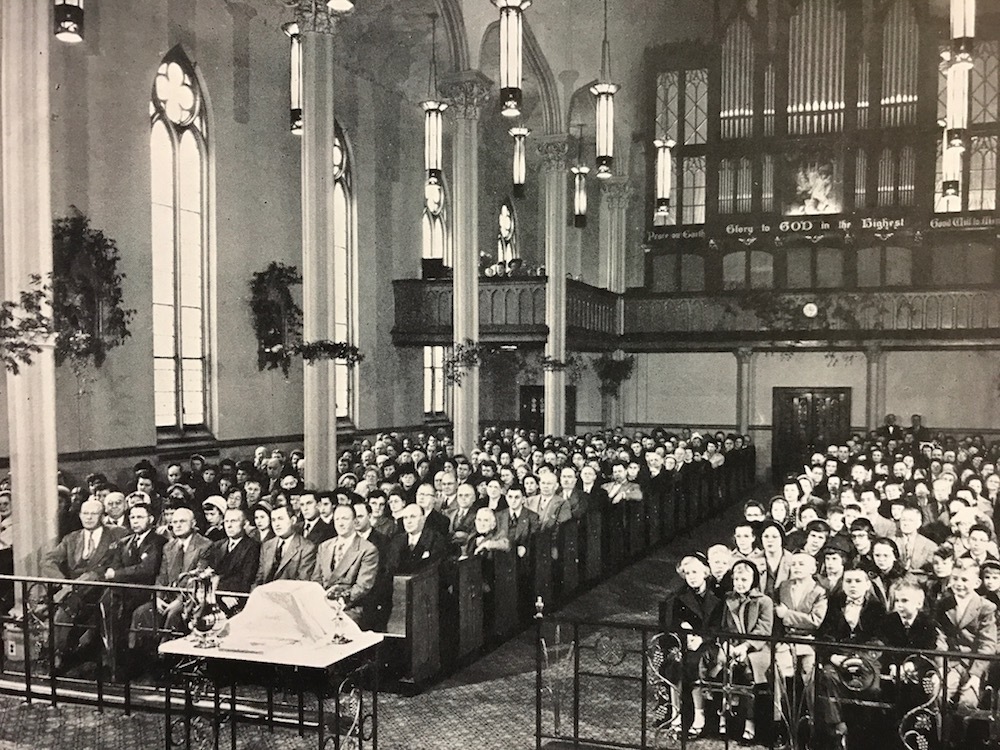 If you could snap your fingers and transport yourself back to that dedication ceremony in 1873, you would immediately be struck not only by the beauty of the new church, but also by the fact that everyone there was speaking German, and that all the services were held in German. For Trinity, the German language has and will always be a part of its cultural heritage, but, just as importantly, language has been for this church, as for other churches in Cleveland, a barometer of change in the parish and change in the neighborhood. From 1853 until 1919, Trinity was a German church and only German was spoken at services. This began to change during the period 1919-1949, as English first became an additionally permitted language at services, and then, shortly after the end of World War II, the only permitted language as it replaced German as the liturgical language for all services. As elsewhere in Cleveland during this period, the parish and the neighborhood were changing as middle-class German-American residents were moving to the suburbs in large numbers, and were being replaced by new residents who were neither German nor middle class. In 1956, Trinity had to confront this sea change head on when its parish was called upon to decide whether to leave the inner city and merge with Holy Cross Church, a Lutheran parish located on Cleveland's far west side, or stay. Trinity's parish chose to stay.
