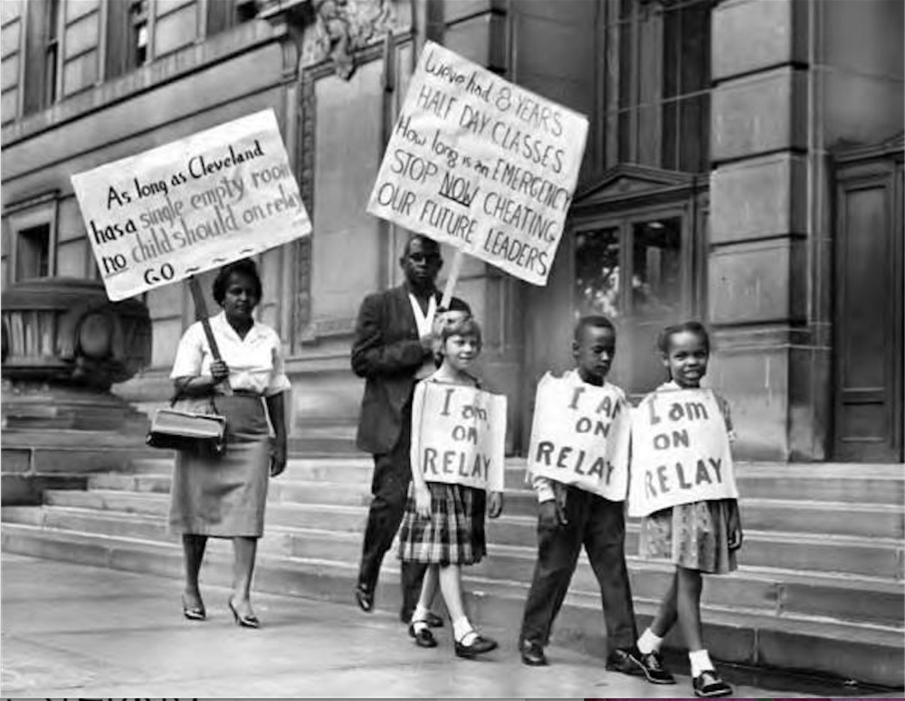 Parents March Against Relay The Cleveland Public Schools policy to manage overcrowded schools was to relay morning and afternoon classes in the neighboorhood buildings while other schools were partially vacant. Racially divided areas and schools persisted. The early movement to challenge this practice began with protests at School Board headquarters. Source: The Cleveland Press Collection, Michael Schwartz Library, Cleveland State University. Date: September, 26, 1961