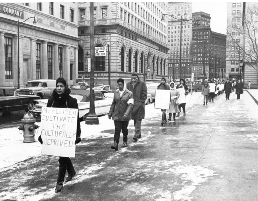 The Early Protest The movement towards awareness of unequal treatment of black students in the Cleveland Public Schools was initiated as a series of protest actions during the 1963-64 school year. In January, 1964 pickets protested Board of Education President Ralph McAllister's stance regarding the handling of balck student overcrowding. Source: The Cleveland Press Collection, Michael Schwartz Library, Cleveland State University. Date: January 28, 1964