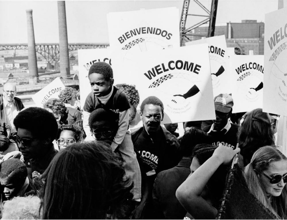 Bridgewalk, 1980 In order to promote peaceful school desegregation as pupil transportation began, a group called WELCOME-Westsiders Eastsiders Let's Come Together staged rallys at the Lincoln Statue and on the crosstown Detroit-Superior Bridge. Source: The Cleveland Press Collection, Michael Schwartz Library, Cleveland State University. Date: Septmber 18, 1980