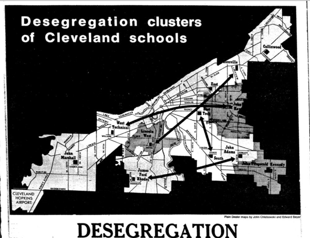 Cleveland's Desegregation Plan High school attendance clusters within the Cleveland Public Schools were paired to implement student assignments and transportation to achieve integrated schools at all levels. The map shows the paired districts to illustrate the assignment patterns for students on both sides of the city. Source: The Cleveland Plain Dealer Date: January 25, 1980