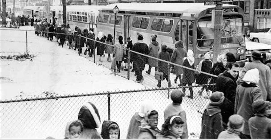 Hazeldell Relay Students Board Buses Efforts to diffuse overcrowding in schools included transporting students to less crowded, but still segregated classes in nearby schools. Regional Transit Authority buses were utlized for this initiative. Source: The Cleveland Press Collection, Michael Schwartz Library, Cleveland State University. Date: January 28, 1964