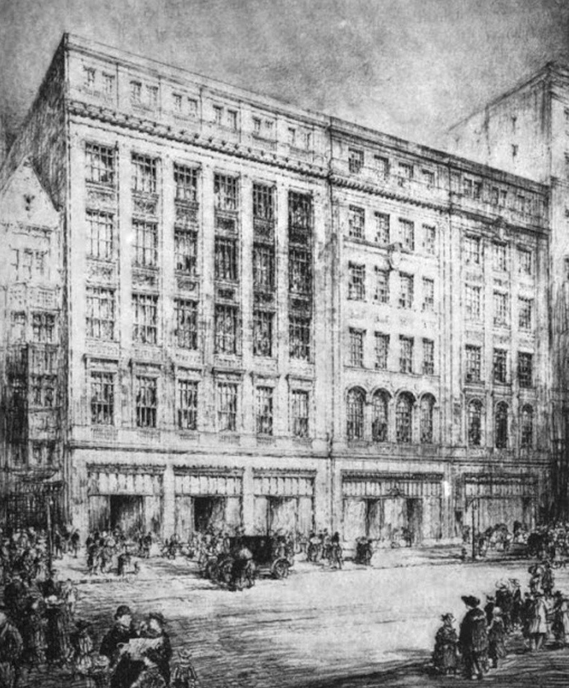 A new facade This sketch prepared by the architectural firm of George B. Post and Sons--the same firm that designed the Cleveland Trust Bank building on the southeast corner of East 9th and Euclid--shows an addition to the formerly S-shaped west end of the John Hartness Brown building, as well as an entirely new front facade, which gives the building the appearance of being three separate buildings. The reconstruction as designed by the Post firm was completed in 1917. Source: Google Books, The Architectural Record, Vol. 47, page 189 (1920)