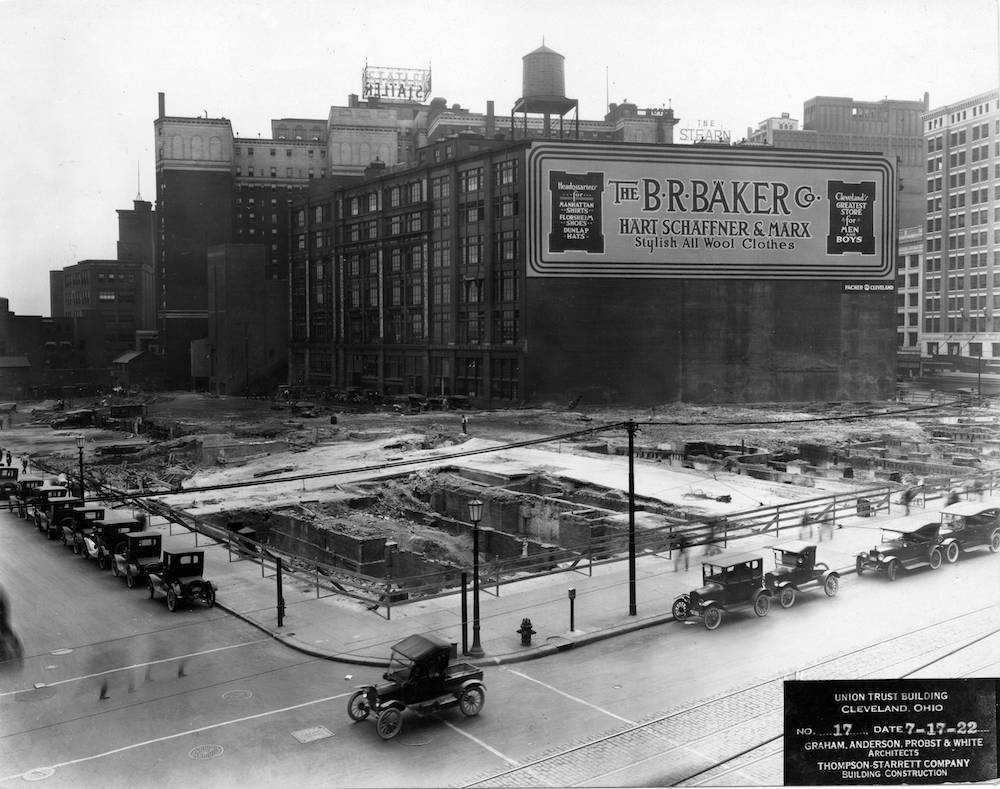 Only the back remains the same The excavated site for the new Union Trust Building on the northeast corner of Euclid Avenue and East Ninth Street in 1922 provides an open view of the rear facade and west side of the John Harkness Brown building, by this year known as the Euclid Building, after the realty company headed by Frank H. Ginn that took over control of the western most portion of the building in 1911. Note that the original design for the rear facade of the building was not substantially changed in the 1917 reconstruction of this portion of the building. B. R. Baker, whose sign appears on the west side of the building, was a tenant in the building from 1917 until 1982. Source: Cleveland Public Library, Digital Photograph Collection