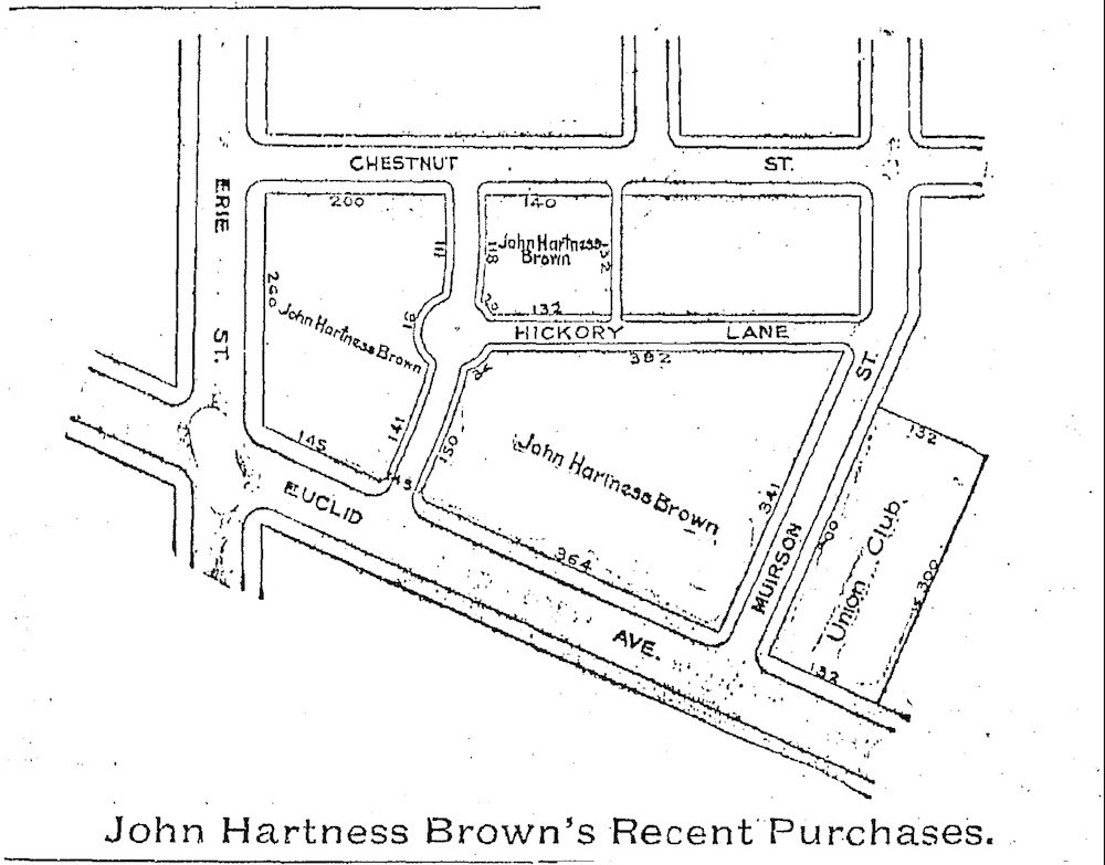 An Empire in the Making This sketch, which appeared in the June 29, 1901 edition of the Cleveland Plain Dealer, shows the extensive land holdings that John Hartness Brown had assembled and controlled north of Euclid Avenue and east of East 9th Street by 1901. Muirson Street and Chestnut Avenue, shown on the sketch, are today, respectively, East 12th Street and Chester Avenue. Hickory Lane still exists, but no longer has an access point on Euclid Avenue. Source: Cleveland Public Library, Historic Newspaper Collection