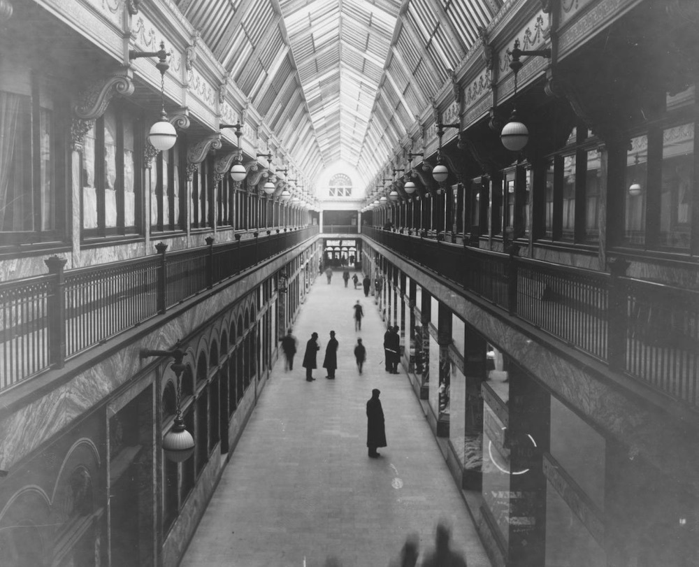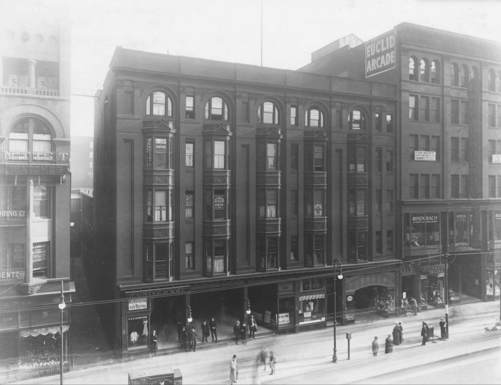 The Colonial Hotel, now called the Residence Inn, is located on Prospect Avenue next to Cleveland’s historic East 4th Street. The hotel was built in 1898 in combination with the Colonial Arcade by designer George H. Smith, who was also the architect of “The Arcade,” Cleveland’s more famous shopping street under glass which was built in 1890. The Colonial Hotel opened on October 21, 1898, with an informal ceremony, which was attributed to the fact that it opened a day earlier than scheduled. The Colonial Arcade, however, was not fully complete until 1911, when John F. Rust hired architect Franz Warner. Warner was able to design an adjacent arcade that would link the William and Rodgers buildings on Euclid Avenue (one block to the north) with the Colonial Hotel, thus creating the Euclid Arcade. Today the interconnected Colonial and Euclid Arcades are known together as the 5th Street Arcades.