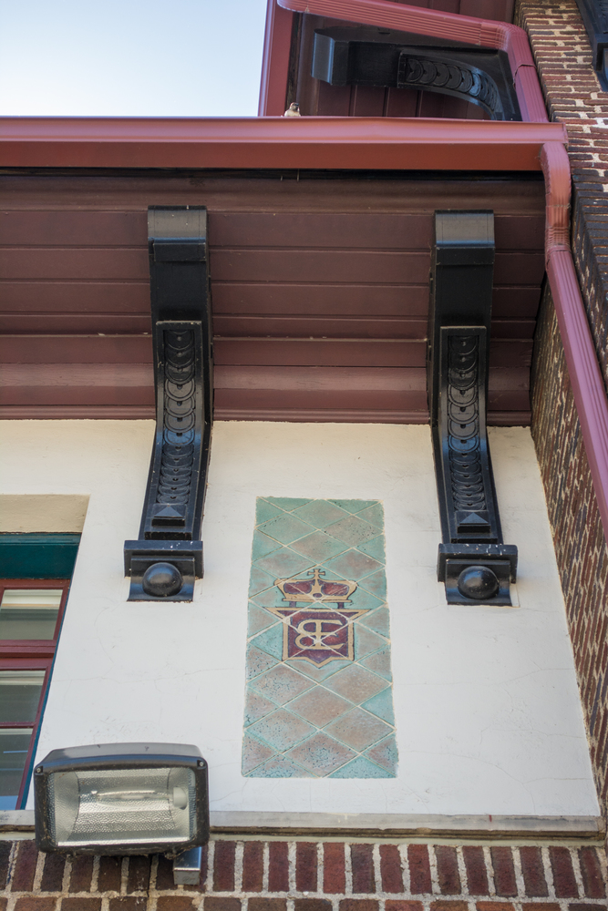 Detail of the Baker Electric Motor Vehicle Company buiding A close up of the front dentil, which is a rectangular blocks resembling teeth which was used as a decoration under the soffit of a cornice in classic architecture. The Backer Electric emblem is in the tile. Source: Flickr Creator: Tim Evanson Date: May 9, 2017