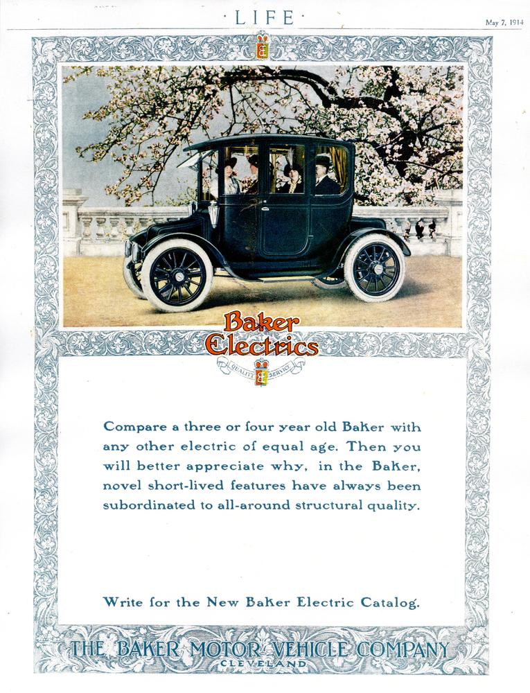 Ad in Life magazine for a Baker Electric vehicle catalogue An ad to request the Baker Electric catalog. It reads, " Compare a three or four year old Baker with any other electric of equal age. The you will better appreciate why, in the Baker, novel short-lived features have always been subordinated to all-around structural quality." Source: Michael on Flickr Date: May 7, 1914