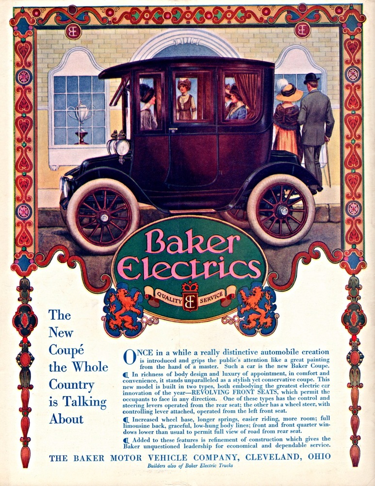 Ad for Baker Electric coupe, 1913 The exciting new feature of the 1913 Baker Electric couple was the revolving front seats. The passengers could revolve the front seats to face the rear seats. One version of the car placed the steering lever at the rear seat, and the other version placed the steering at the front left seat. Source: Alden Jewell on Flickr Date: 1913