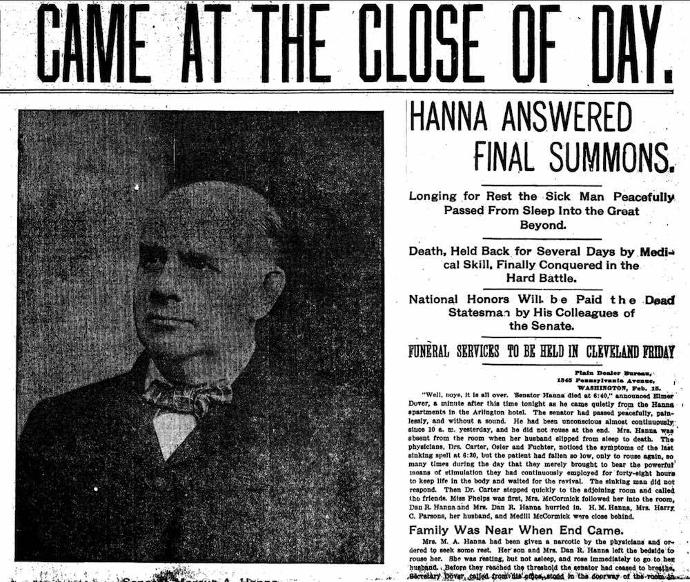 The Hanna Building was named after the famous U.S. senator from Ohio and oil and coal baron Marcus Alonzo Hanna and built by his son Daniel Rhodes Hanna. Hanna is perhaps best known for having endorsed William McKinley for president in 1896, spending $100,000 of his personal funds to support McKinley's campaign. McKinley won the election, and as a token of gratitude, McKinley aided Hanna in becoming a senator. Hanna's bronze bust is a prominent feature in the building's lobby.