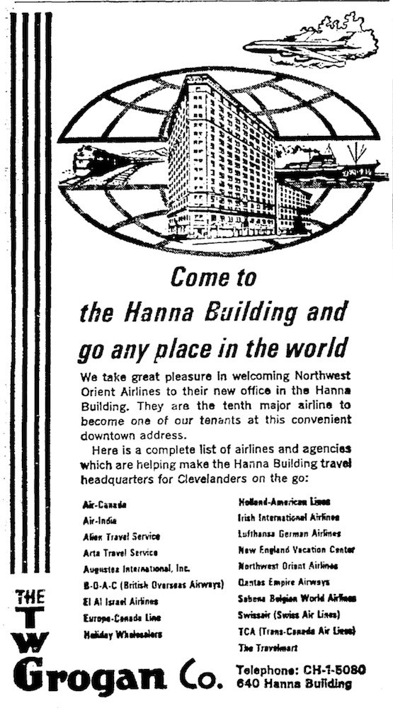 The 1960s saw the Hanna Building become the unofficial travel capital of the area. This is due to the rise of commercial jets, which were much faster than commercial aircraft driven by props and thus became popular very quickly. In the early 1960s, the T.W. Grogan Company adopted the slogan "Come to the Hanna building and go any place in the world." By 1967, travel related companies had a combined 25,000 square feet of office space out of a total 247,000 square feet, which meant that these firms had the largest amount of office space rented by any group of related businesses. By the end of the decade, the building was home to 16 airline offices, 5 travel agencies, 2 car rental agencies, a steamship line office, and even a Vermont tourist information center.