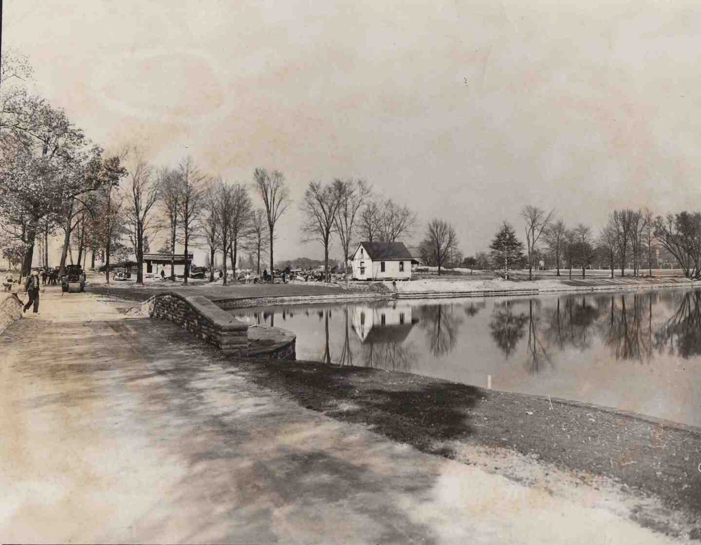 Lagoon, Nov. 1939 This photograph from November 1939 shows the area around the lagoon in Forest Hill Park under construction. When the park opened in 1942, the man-made lagoon featured a new boathouse, replacing the smaller structure in the middle of this image. Source: Cleveland Memory, Cleveland State University Library Special Collections Date: 1939