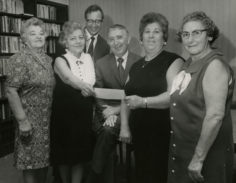Shaker-Lee Sisterhood, 1970 Pictured is the Shaker-Lee Sisterhood presenting their donation of $1,500 for the Israel Emergency Fund. Launched in 1967 by the United Jewish Appeal, the fund helped finance educational, medical, humanitarian, rehabilitation and resettlement programs for Jewish refugees that had been absorbed into the State of Israel. Source: Cleveland History Center of the Western Reserve Historical Society