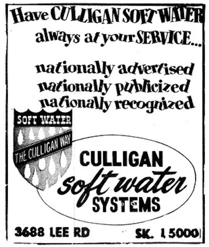 Culligan Soft Water Systems, 1950 A franchised dealership of Culligan Soft Water Systems operated out of the commercial property at 3688 Lee Road from as early as 1947. More than one thousand Culligan dealers were located throughout the country by 1950. Source: Advertisement, Cleveland Plain Dealer