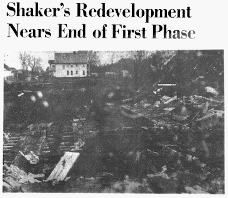 Demolition on Sutton and Colwyn, 1969 Despite the need to demolish a number of homes for the Sutton Place townhouse project, there was relatively little public outcry over the project. One reason was the area's undesirability as a site for new construction or housing rehabilitation. The lands were plagued by regular flooding. Through landscaping, inclusion of green spaces and decreased housing density, the Sutton Place project offered new life to the residential neighborhood. Source: "Shaker Redevelopment Nears End of First Phase." Sun Press, 13 November 1969.