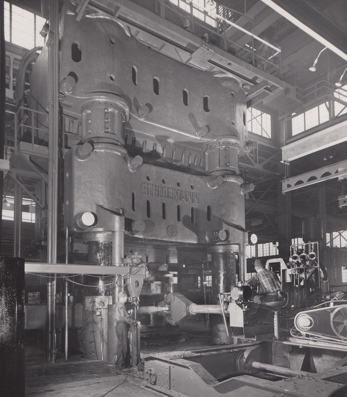 Alcoa's Hydraulic Forging Press, 1952 Sutton Place was built as an experiment in residential housing by Alcoa Construction Systems, Inc., an affiliate of Alcoa Building Industries, a division of the Aluminum Co. of America. Alcoa has a long tradition of developing new uses for aluminum, often in partnership with other industries. Dating back to the creation and marketing of an aluminum teakettle in 1895, Alcoa has pioneered the use of its alloys in automobile bodies and wheels, aerospace technologies, high-rise and residential buildings, pull tabs for cans and unbreakable bottles. Source: Cleveland Public Library Photograph Department