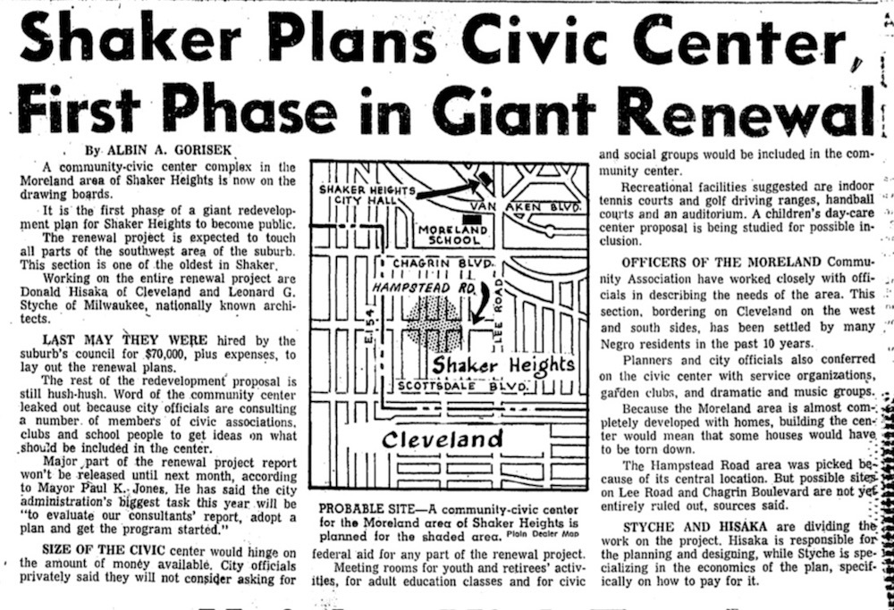 The African American community in Moreland continued to grow throughout the 1960s, facilitated by the increased number of homes placed on the resale market. While the integrated community association eased neighborhood tensions during a time of rapid racial transition, its successes in attracting new white home owners to the area were limited. By the mid-1960s, MCA shifted its emphasis to advocating for large-scale urban renewal projects. A task force, composed in part by Moreland residents and representatives of the City, recommended the development of a master plan for the community in 1966. These efforts culminated in the Styche-Hisaka Plan, an ambitious locally funded urban renewal project that focused on the redevelopment of Shaker Heights’ southern neighborhoods. Plans for Moreland included the revitalization of its commercial district, street improvements and the removal of older, high-density housing stock. A civic center, townhouses, park spaces and service center were proposed to replace many residential homes. While the civic center was never realized due to objections by the Moreland community, homes would be demolished to make room for the Shaker Heights Service Center and a park-townhouse development.