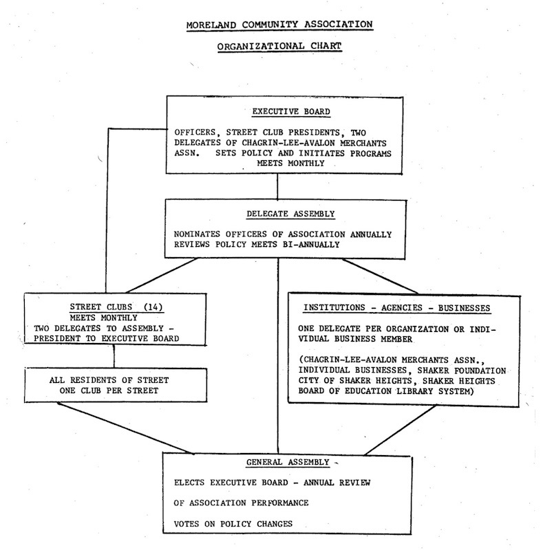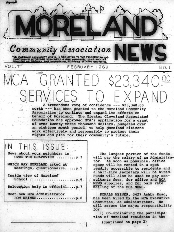 Since the early 1960s, Moreland’s community associations helped formulate, shape and implement nearly every urban renewal and redevelopment project initiated by the City of Shaker Heights in the neighborhood. The Moreland Community Association (MCA), established in the spring of 1962, was the first of these groups. The organization acted as the front line for identifying and publicly addressing perceived threats to community stability, and functioned as an intermediary between local residents and governing organizations. From the minutia of announcing everyday community activities to the tackling of contentious social, religious, economic and political matters, MCA had a hand in nearly every aspect of life in Moreland. Their resume of achievements included helping to guide the development of the Shaker Heights Service Center, Chelton Park, the Sutton Townhouse Development Project and Shaker Towne Center. The association also galvanized public support for urban renewal projects, advocated for street improvements, aided in implementing and educating residents about housing code enforcement, offered funds for housing upkeep to low income residents, precipitated a minor barricade controversy, purchased and rehabilitated vacant homes, published newsletters, sponsored public debates and held street fairs. By consolidating and amplifying the voices of neighborhood activists, MCA offered a platform for select residents to have a say in defining the future of their community.