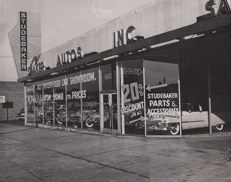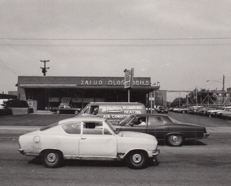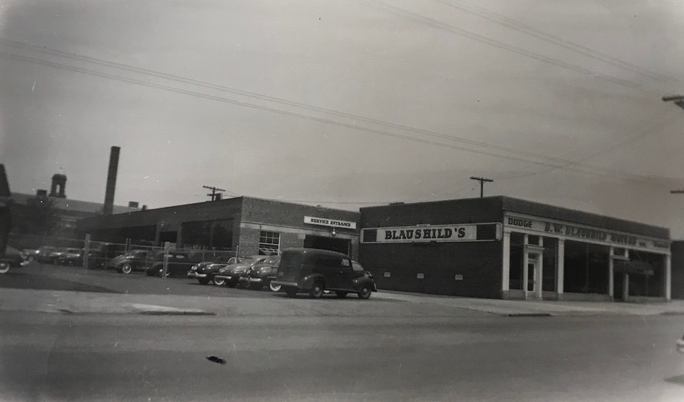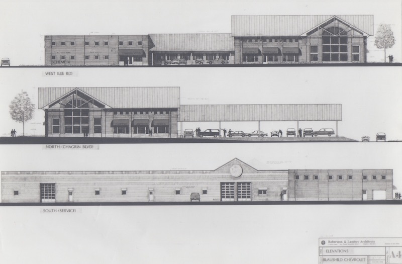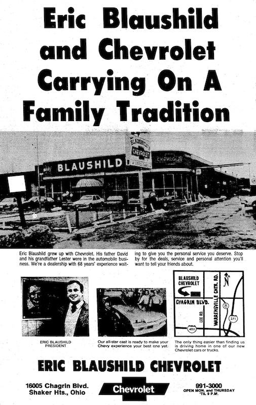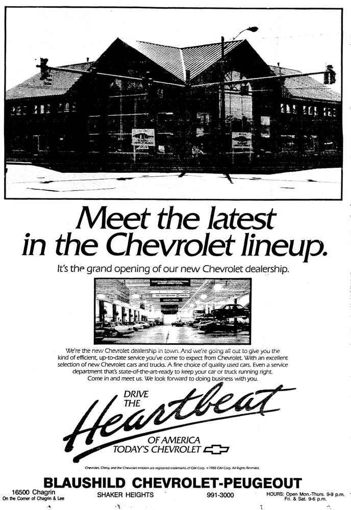 David Blaushild worked for his father’s auto dealership beginning in 1938. With the advent of World War II, David enlisted in the U.S Army Air Forces. Joining in 1942, he served as a photo intelligence officer in Europe for nearly the duration of the war. Upon his discharge, Lester offered David the choice to work in the mechanic shop or frontroom. David chose the latter, at which point his father removed himself from the business’ daily operations. Following the relocation of both the Dodge-Plymouth and Chrysler-Plymouth auto dealerships to Shaker Heights at midcentury, the Blaushild name became a fixture in the emerging Kinsman-Lee auto row. A year after Lester’s death in 1958, David transitioned the business into a Chevrolet dealership. The Chevrolet dealership expanded to include a showroom across the street at 16222 Chagrin Boulevard in 1963.