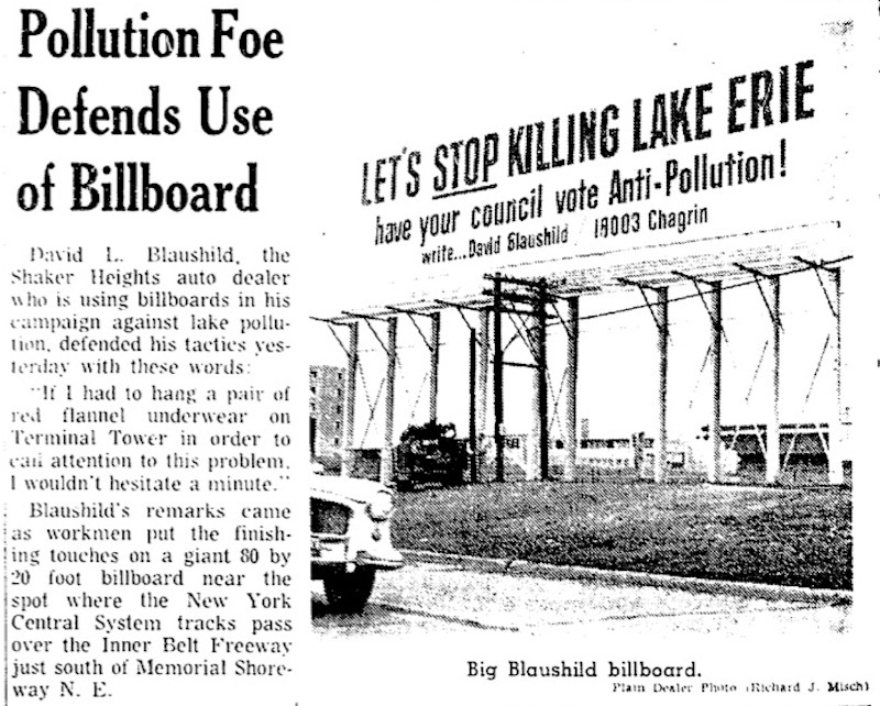 In July of 1964, motorists traveling along the Inner Belt Freeway south of Memorial Shoreway were greeted by the newest billboard from Shaker Heights auto dealer David L. Blaushild. Bold letters spanning a giant 80- by 20-foot sign declared: “Let’s Stop Killing Lake Erie, have your council vote Anti-Pollution! write…David Blaushild 16003 Chagrin.” The environmentally conscious car salesman acquired free use of 15 billboards in the Cleveland area, and was using them to draw attention to the issue of lake pollution. A series of advertisements in Cleveland’s newspapers complemented the imposing signage, and called on the citizenry to join the crusade. Blaushild asked Clevelanders to express their support for the cause by filling out and mailing in a coupon to his dealership, which would be forwarded to public officials. An overflow of public response prompted the salesman to expand his efforts. He began sending both petitions and an antipollution resolution to those that replied to his ads. The respondents could then circulate the petitions within their communities throughout the greater Cleveland area, and submit with the proposed statement of position to local governing bodies for adoption. By some accounts, over half a million signatures were gathered between June and August. Twenty-six towns along Lake Erie passed Blaushild’s resolution calling on the Ohio Governor to take steps towards preventing industrial and sanitary pollution from reaching public waters.