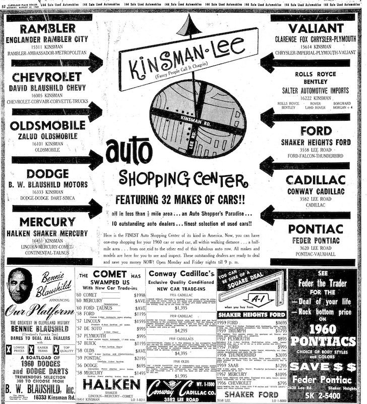 David Blaushild’s Moreland-based Chevrolet dealership served as headquarters for the petition drive. Both his surname and automobile promotions had long been known in the Cleveland and Shaker Heights area. Just one year prior, he had caused a minor stir with another billboard located near Fairhill (Stokes Boulevard) and Petrarca Roads. As described by Cleveland Plain Dealer, “Tired businessmen driving home…have been met by the sight of two scantily clad young women cavorting on the catwalk of a billboard.” Police intervened after receiving complaints, which Blaushild chalked up to the doings of rival auto dealers. Beyond enlisting bikini-models to sell cars, he was also known for imaginative radio and print advertisements. In 1963, Blaushild employed the Cleveland Orchestra to record a minute-long jingle promoting a “classically, classical deal at David Blaushild Chevrolet.”
