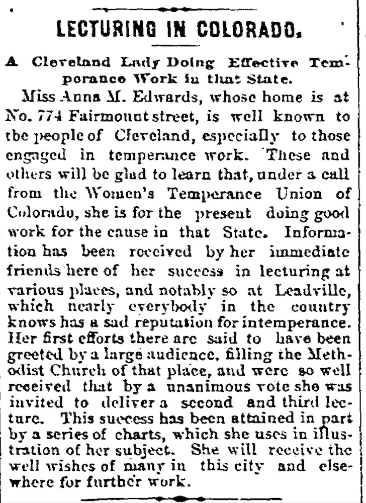 Traveling Across the Country In November 1880, Anna M. Edwards travelled to Leadville, Colorado to deliver temperance speeches to a community then known nationally for its intemperance. This article from the Cleveland Leader, applauding her work there, appeared in that newspaper on November 11, 1880. Source: Cleveland Public Library, Digital Newspaper Collection