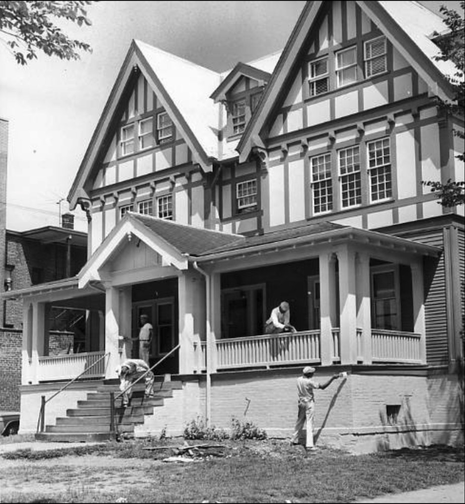 Restoring an old Settlement House In the early 1960s, under the leadership of Director Shirley Luatrschlager, Rainey Institute was renovated and slowly began to provide better services to the African-American children who now lived in Cleveland's Hough neighborhood. The Institute is getting a fresh coating of paint in this 1962 photo. Source: Cleveland Memory Project, Identifier rainey003.jpg, Cleveland State University, Michael Schwartz Library, Special Collections, Creator: Clayton Knipper Date: November 9, 1962