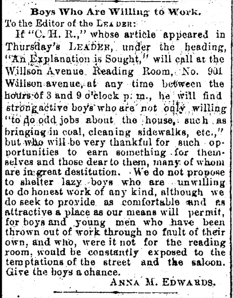 Give the Boys a Chance In this Letter to the Editor, which appeared in the Cleveland Leader edition of December 23, 1893, Edwards, then head of the Non-Partisan WCTU Reading Room at 901 Willson Avenue (today, approximately 1575 East 55th Street), explains her mission work with young boys--then largely the children of East European immigrants-- living in what today is Cleveland's Hough neighborhood. Source: Cleveland Public Library, Digital Newspaper Collection