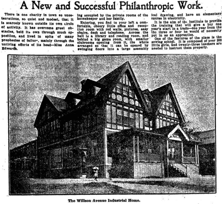 In 1888, Edwards took over the chairmanship of a WCTU reading room located on Willson Avenue, re-energized the neighborhood "Band of Hope" (a temperance pledge youth group), and opened the Flag Coffee House (so-called because of the flags she placed in its windows). The coffee house openly and actively competed with nearby saloons by offering boys a full dinner and a cup of coffee for just ten cents. Her work with the boys of this neighborhood eventually caught the attention of Eleanor B. Rainey, the widow of a wealthy Cleveland industrialist, who offered to provide Edwards with a larger and better facility for her work.  Rainey purchased a lot on the northeast corner of Willson and Dibble Avenues and built on it a three-story, 9,000-square-foot building, designed in the Tudor style by architects Badgley and Nicklas to resemble a large house. Officially called the Willson Avenue Industrial Institute, it opened in 1904. It had offices, and reading and game rooms, on the first floor; classrooms and a gymnasium on the second floor; and a custodian's apartment on the third floor. (Walfred and Anna Danielson, immigrants from Sweden and Canada respectively, and their son Harold, lived in that apartment and worked for the Institute for much of the period 1904-1940.)