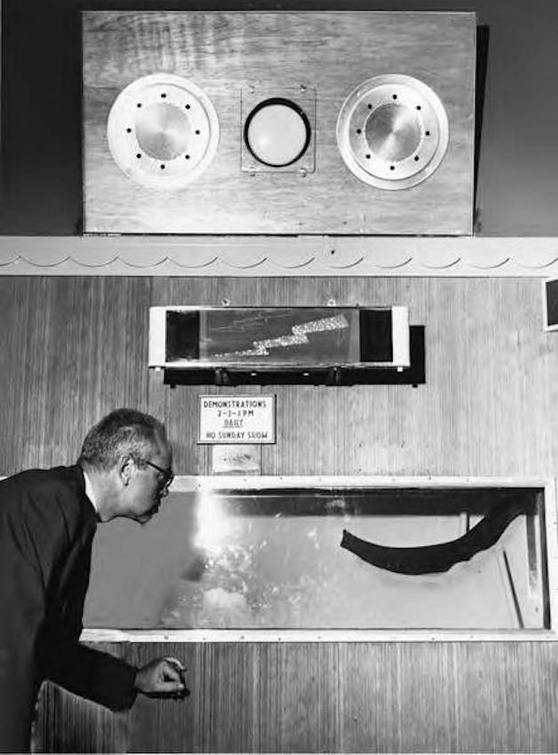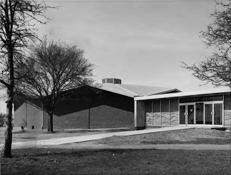 Gordon Park had evolved from a bathing beach attraction on Cleveland’s east side along Lakeshore Boulevard during the 1940s and 1950s. The construction of an improved Memorial Shoreway (later part of Interstate 90) split the park into a lakefront boat access area and an inland park area with sports fields and picnic areas. The limited beach access and usage led the former bathhouse on the inland grounds to be converted to a Trailside Museum by CMNH in 1943. It housed natural history specimens of the area, including several small aquariums containing fish from Doan Brook and Lake Erie. The opportunity to create a large, dedicated, public aquarium became a reality with the cooperative efforts of the city, CMNH, and the volunteers who planned and built the facility to house local aquatic specimens as well as tropical species in a controlled habitat. Director William Kelley characterized the Cleveland Aquarium as an applied research center—as opposed to a “fish circus”—and hoped to continue the research theme to influence other aquaria around the world.