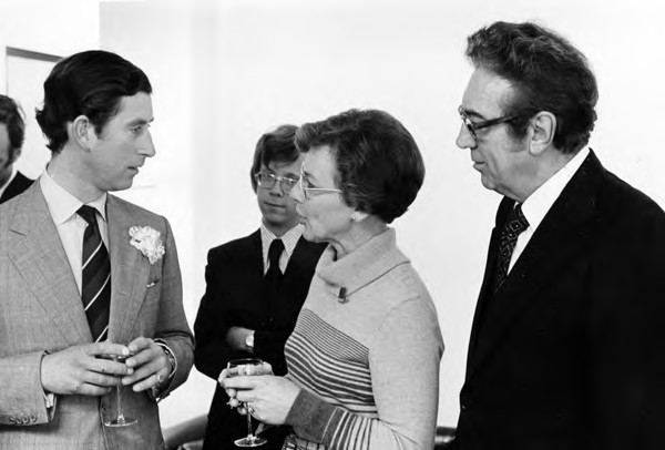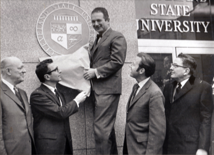 Prince Charles dedicates the new Law Building In 1977, Prince Charles of England traveled to Cleveland to formally dedicate the new Cleveland-Marshall College of Law building on the corner of East 18th Street and Euclid Avenue. Shown in the photograph with the Prince are left to right: Terrance Brennan, Cleveland Marshall study body president, an unidentified woman, and Cleveland mayor Ralph Perk. Source: Image courtesy of Cleveland State University Library, Special Collections