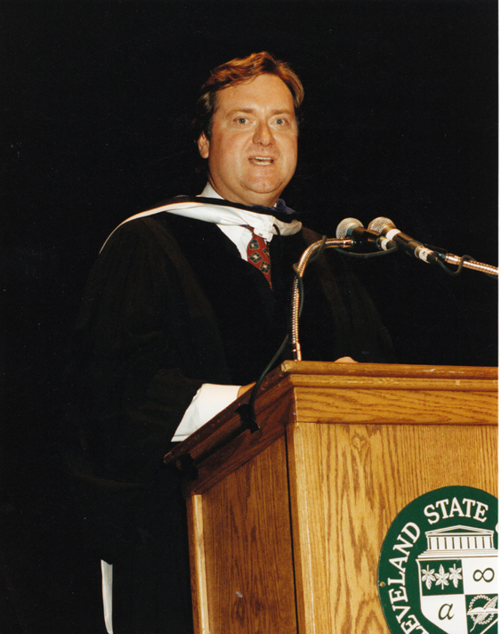 Tim Russert, 2007 Nationally-known journalist Tim Russert graduated from Cleveland State University's Cleveland-Marshall College of Law in 1976. He is shown here speaking at the school's 2007 commencement ceremonies. Russert tragically died of a heart attack just one year later in 2008. Source: Image courtesy of Cleveland State Library Special Collections