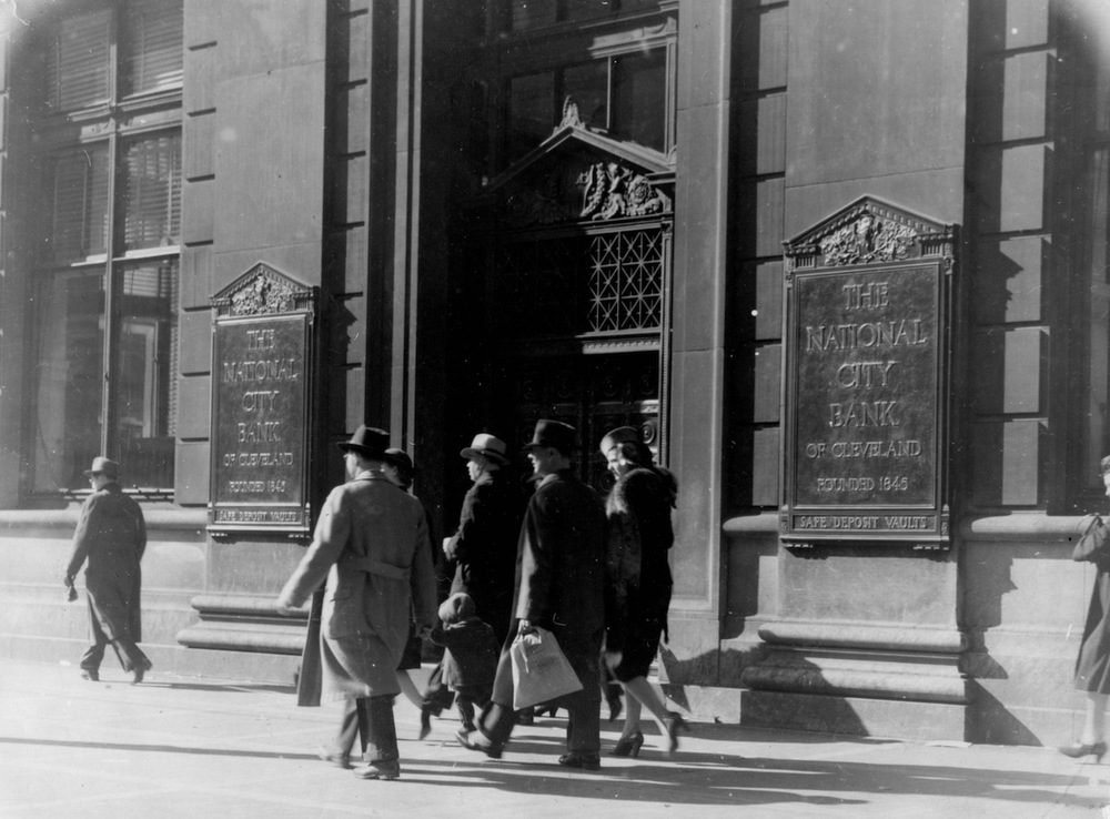 National City Bank The front of the National City Bank with pedestrians walking by in the New England Building. The National City Bank bought the building from the Guardian Savings and Trust Company after it was forced to liquefy its assets. Source: Cleveland State University Library Special Collections