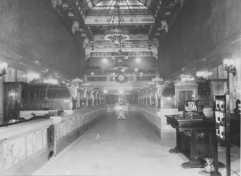 Another Interior View of Bank This photo shows the banking lobby prior to the Walker and Weeks transformation. Source: Cleveland Public Library Photograph Collection