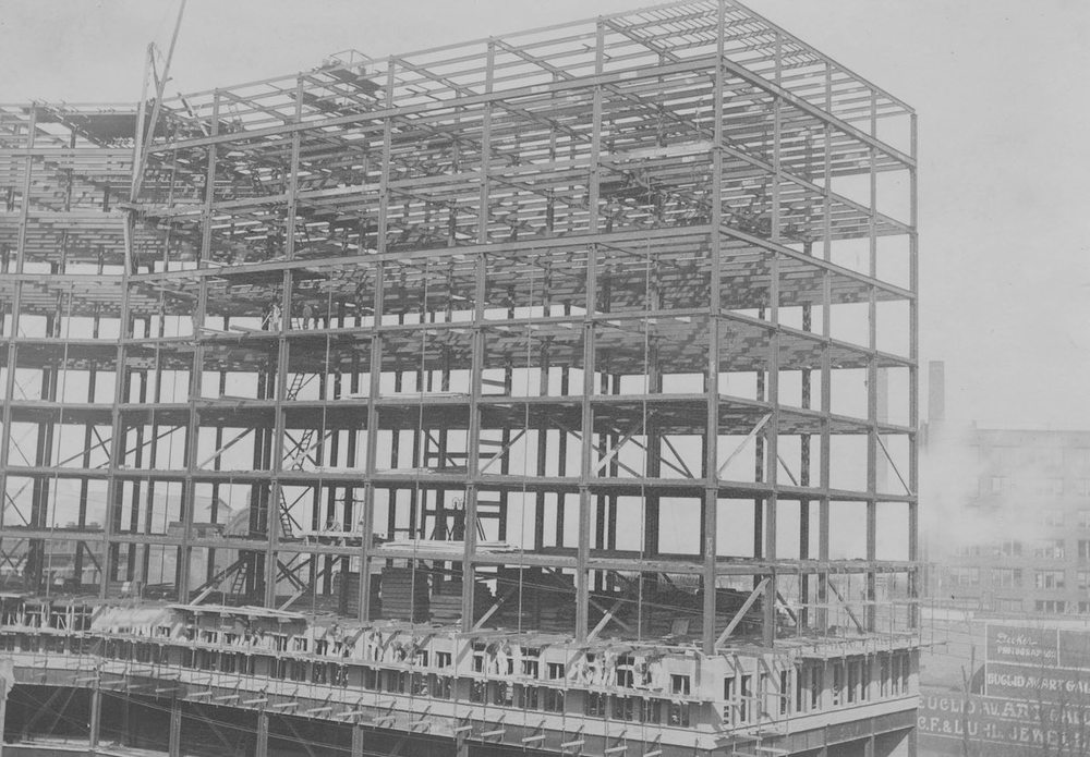 Construction of New England Building The steel skeleton of the New England Building was still fully exposed in this early photo. Source: Cleveland Public Library Photograph Collection Date: 1895