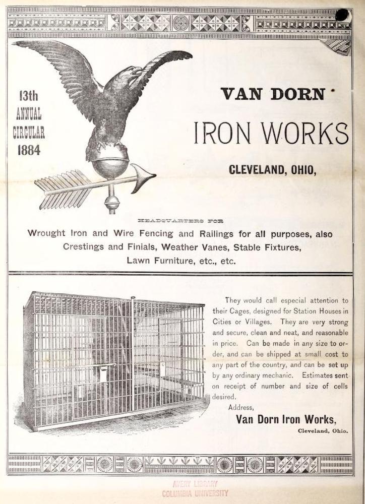 By the 1910s, Van Dorn Iron Works became best known for manufacturing jail cells, which J. H. Van Dorn claimed to be no more than “fences built indoors.” The company became the largest manufacturer of jail cells in the world for several decades in the twentieth century, assembling nearly 28,000 jail cells from 1918 to 1938 that it sold throughout the U.S. and foreign countries. Van Dorn supplied cells for a variety of prisons across the U.S., including the Connecticut State Prison, Nebraska State Prison, West Virginia State Prison, Maryland State Penitentiary, and the Tombs Prison in New York. Van Dorn also assembled jail cells throughout Ohio, including for the Cuyahoga County Jail and the city jails in Cleveland, East Cleveland, and North Royalton.