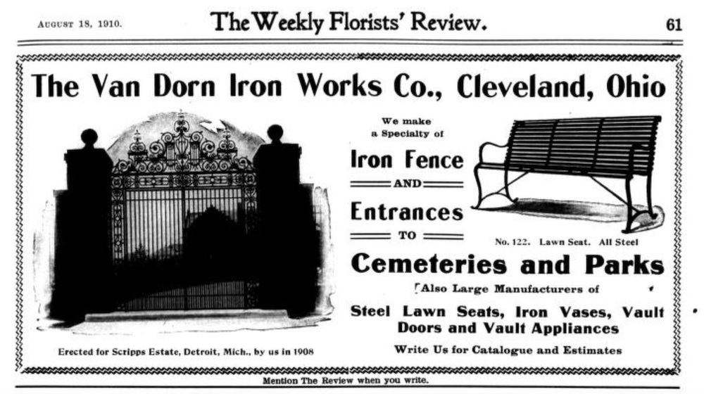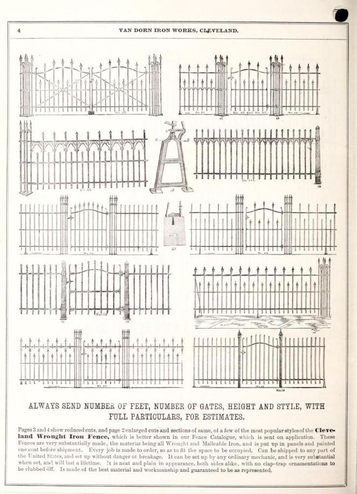 The Van Dorn Iron Works Company was one of the leading companies in the iron industry and later plastic molding industry throughout the twentieth century. J. H. Van Dorn started his business in 1872 from the basement of his Akron home where he created a unique style of wrought iron fencing that he displayed in his own front yard which was said to be “such an interesting exhibit that it became town talk.” In 1878, Van Dorn moved his expanding business to Cleveland renaming it the Cleveland Wrought Iron Fence Company.