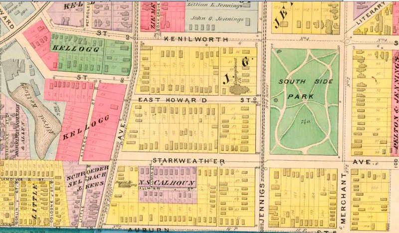 South Side Park This part of the Cuyahoga County Atlas of 1892 reveals the configuration of the walking paths on South Side Park in what is today the Tremont neighborhood. The park was named South Side park in 1879 when it was purchased from the heirs of Brewster Pelton, the South Side resident who had fought the city in court for years to keep the park private. The park was renamed Lincoln Park in 1896. Source: Cleveland Public Library Map Collection Date: 1892