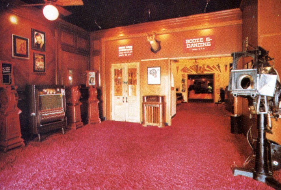 But moving pictures are what made The Last Moving Picture Company truly unique. Cut into every wall of the restaurant was a movie screen, behind which were small closets containing an 8-millimeter projector and stacks of old films. Rushing frantically from closet to closet to change reels, a full-time projectionist would treat patrons to endless (and soundless) streams of Buster Keaton, Charlie Chaplin, Mae West and Harold Lloyd . . . sort of a sports bar for movies. Accordingly, the restaurant’s menu was a Hollywood smorgasbord: Fatty Arbuckle was a hamburger. Boris Karlov was a Polish sausage. Joan Crawford was a sirloin. Marilyn Monroe was (what else?) a cheesecake. Complementing the films and filets, the restaurant and upstairs bar featured countless kitschy accoutrements: a nickelodeon, a ticket booth cashier’s station, an old film projector repurposed to dispense beer. Music was piped through old floor radios. Placemats were laminated movie cards.