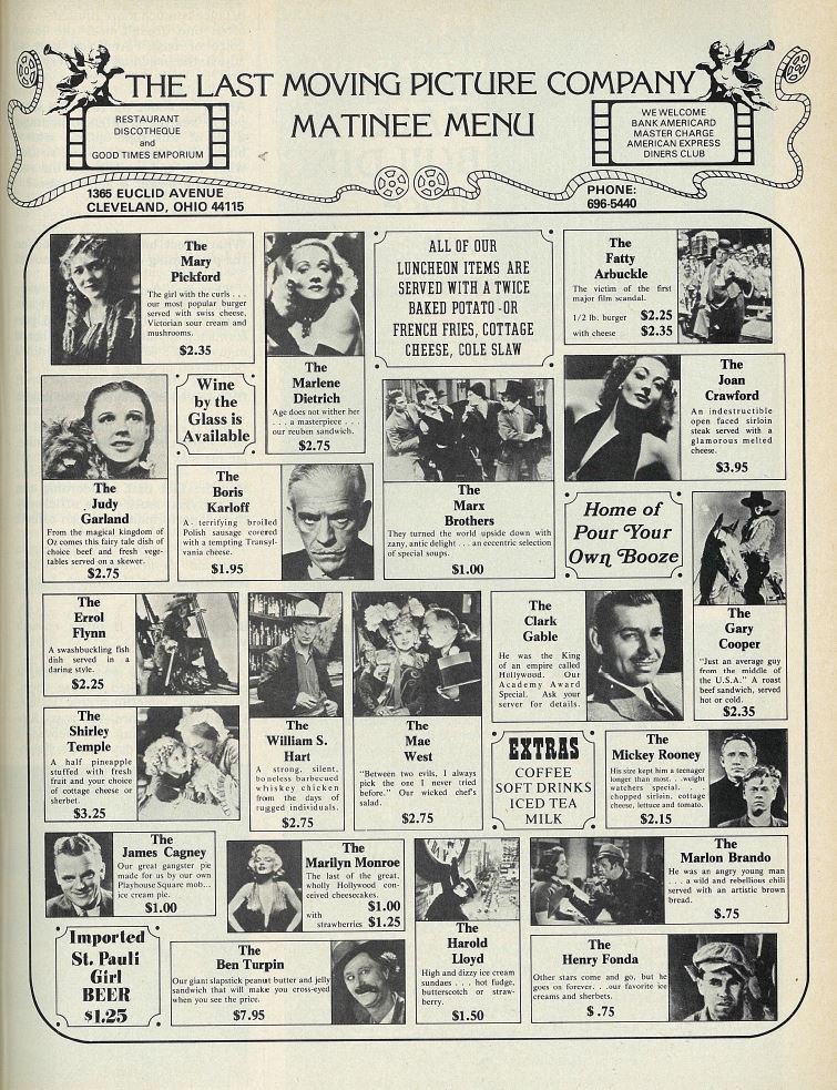 Feast with Flynn, Dine with Dietrich LMPC's "Matinee Menu" offered customers an opportunity to eat a star. Source: Cleveland Plain Dealer Date: August 1975