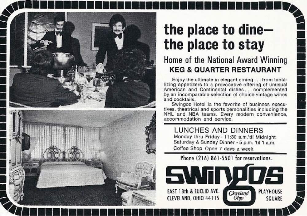 Swingos expanded his foodservice empire. He opened two additional restaurants at Nick Mileti’s Coliseum (where he was listed on the Cavaliers roster as “team dietician”). He also took over Marie Shriver's at the Statler Hotel, renaming it Swingos at the Statler. And when he cashed out at 18th and Euclid in 1984, he opened the moderately successful Swingos on the Lake in the Carlyle Apartment (now condo) complex on Lakewood’s Gold Coast.