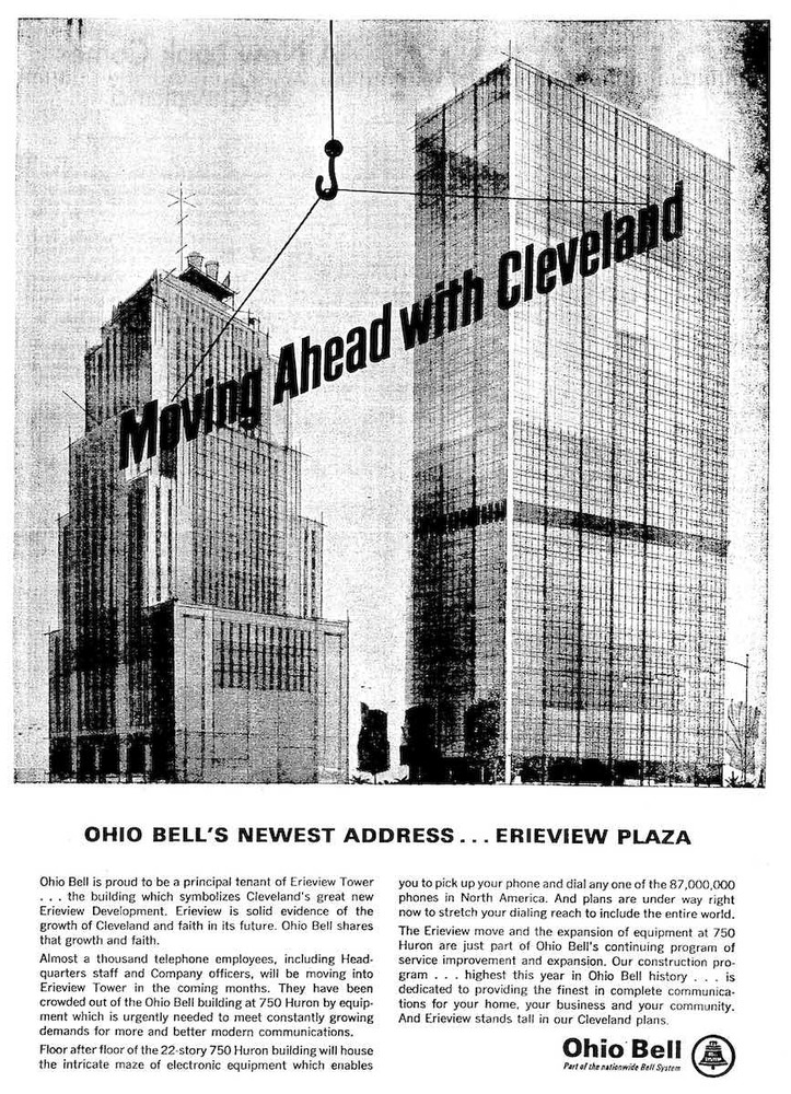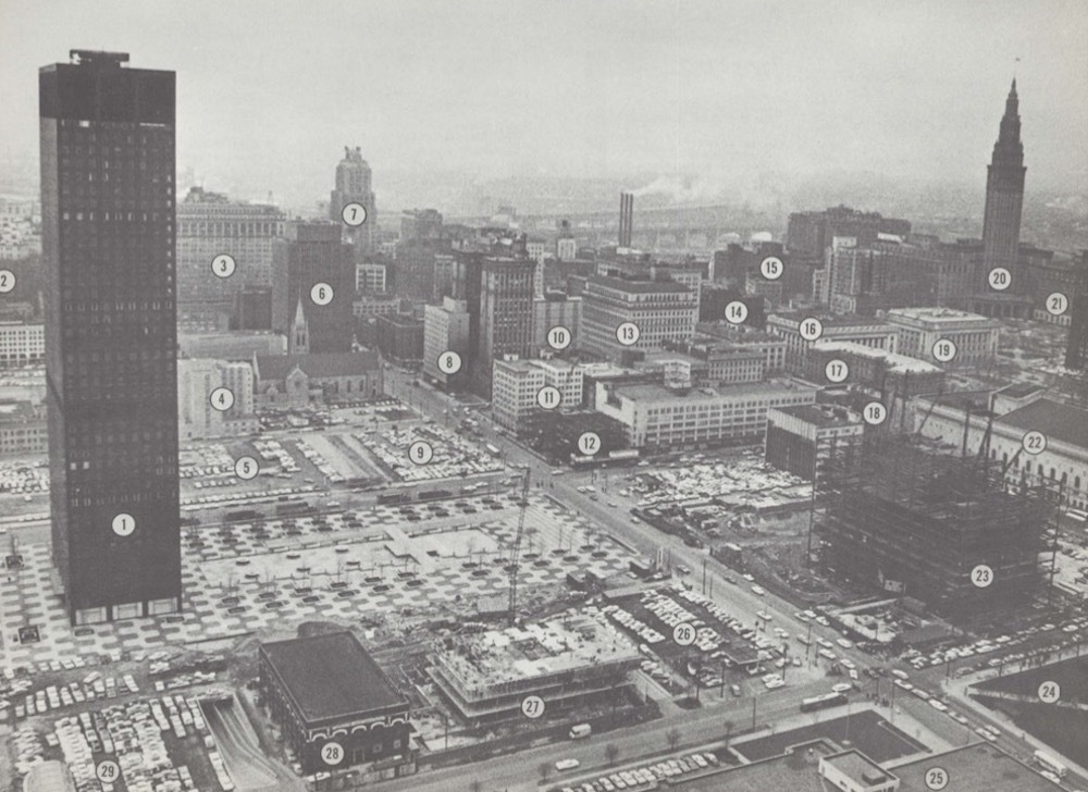 In 1973, architectural critic Ada Louise Huxtable described "a huge, bleak, near empty plaza with a complete set of non-working fountains and drained pools, focusing on a routine glass tower by New York architects Harrison and Abramovitz, known to Clevelanders as the 'jolly green giant.'" She lamented that the plaza was flanked by "vast, open parking lots." Huxtable was referring to Erieview Plaza and Erieview Tower, together the focus of the Erieview urban renewal project, which she derided as a "monument to everything that was wrong with urban renewal thinking in America in the 1960s." Erieview attracted more than architectural criticism. Some Clevelanders also argued that the project set back the downtown district it was intended to revitalize. Plain Dealer columnist Philip W. Porter called Erieview "the mistake that ruined downtown." Porter wasn't alone. Even in the 1960s, some downtown interests worried that Erieview, which some considered a "surrogate downtown," might siphon energy away from the downtown shopping district. Would Erieview workers continue to walk several blocks to Euclid Avenue to shop on their lunch break, or would they demand amenities in a new, self-contained city-within-a-city?