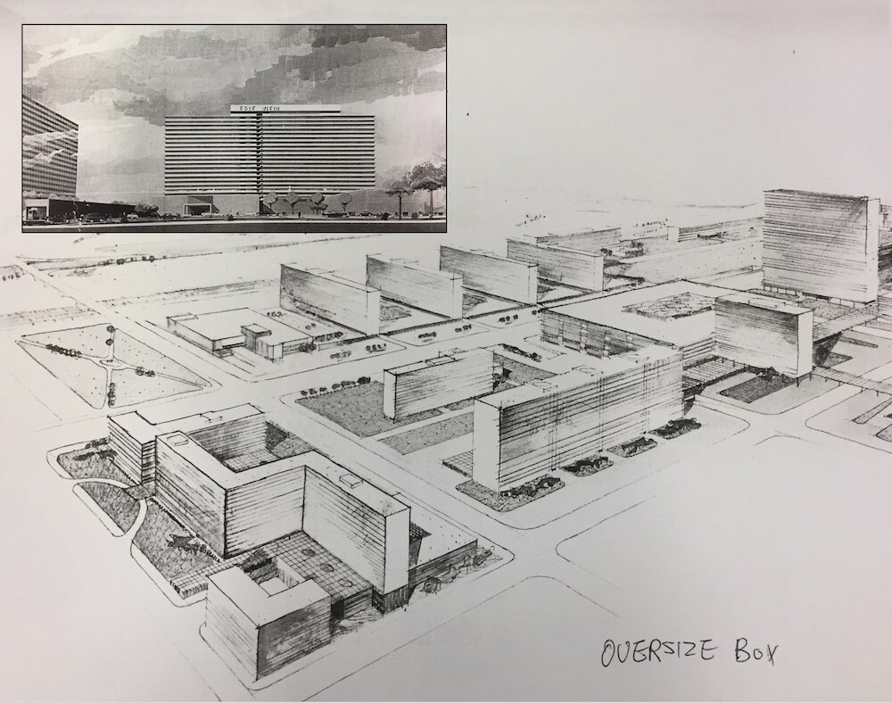 Erieview was billed as an antidote for an ailing downtown, on one hand, and as an outlet for downtown's expected office boom, on the other. While these aims may appear contradictory – one intended to reverse decline and another to accommodate anticipated growth – they actually reflected the complex situation facing downtowns in the 1960s. Suburban retail competition was causing downtown shopping to wither, but at the same time many firms were eager for more spacious, modern office space. Erieview initially spurred overdue renovations by several leading downtown department stores. That their efforts ultimately failed to save them owed less to Erieview than to the effects of population decline, suburban retail growth, and the city's failure to cultivate a strong convention trade. Office expansion promised a counterpoint to retail slippage. After Erieview Tower, the 32-story Federal Building (1967), two major hotels (today’s Westin and Doubletree) and a half-dozen major office towers, including headquarters for Diamond Shamrock (1972) and Eaton (1983), opened incrementally over the next two decades.