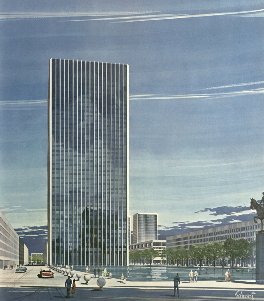 Developers John Galbreath and Peter Ruffin planned to build one or more office towers in Erieview, including the focal building at its heart. The 529-foot-tall, 40-story Erieview Tower was designed by the New York firm of Harrison and Abramovitz. Firm partner Wallace Harrison was best known for his work on Rockefeller Center and the United Nations, but the Erieview design more closely resembled the firm's 45-story Socony-Mobil Building (1956) in New York, also developed by Galbreath and Ruffin. Erieview Tower was a simplified version of its predecessor, substituting black and green glass curtain walls for black windows and silver patterned aluminum walls. Yet both buildings were later panned by some as "ugly" designs. True to its nickname, the greenish tower did loom, giant-like, over the wide-open expanse of Erieview Plaza whose fountains and reflecting pool doubled as an ice rink in winter. Widespread clearance left mostly parking lots surrounding Erieview Plaza for years.